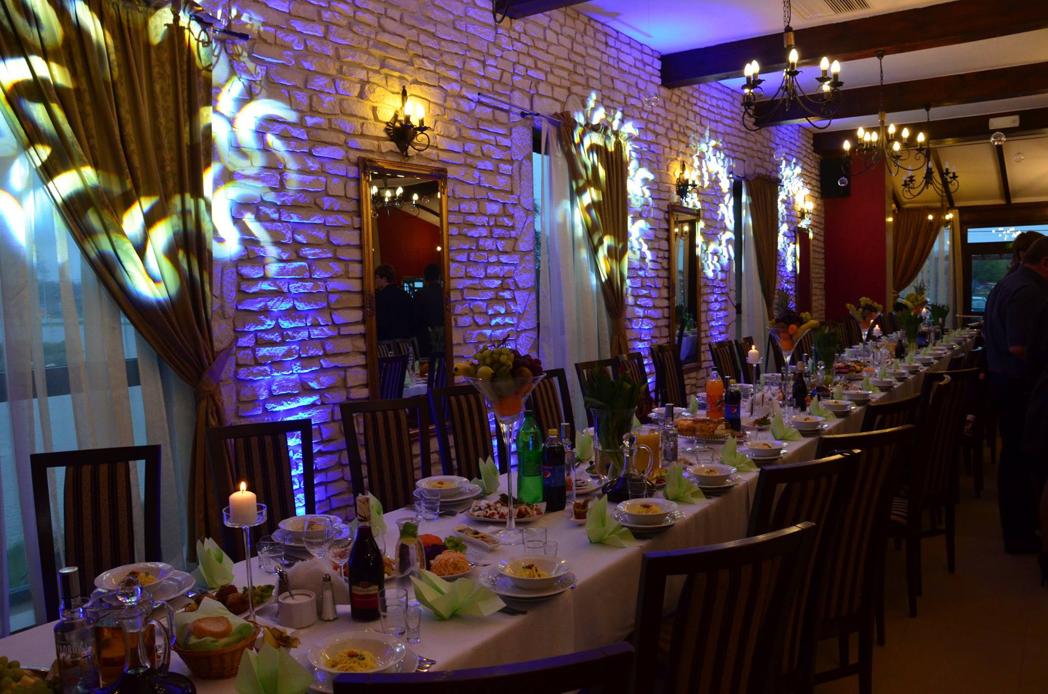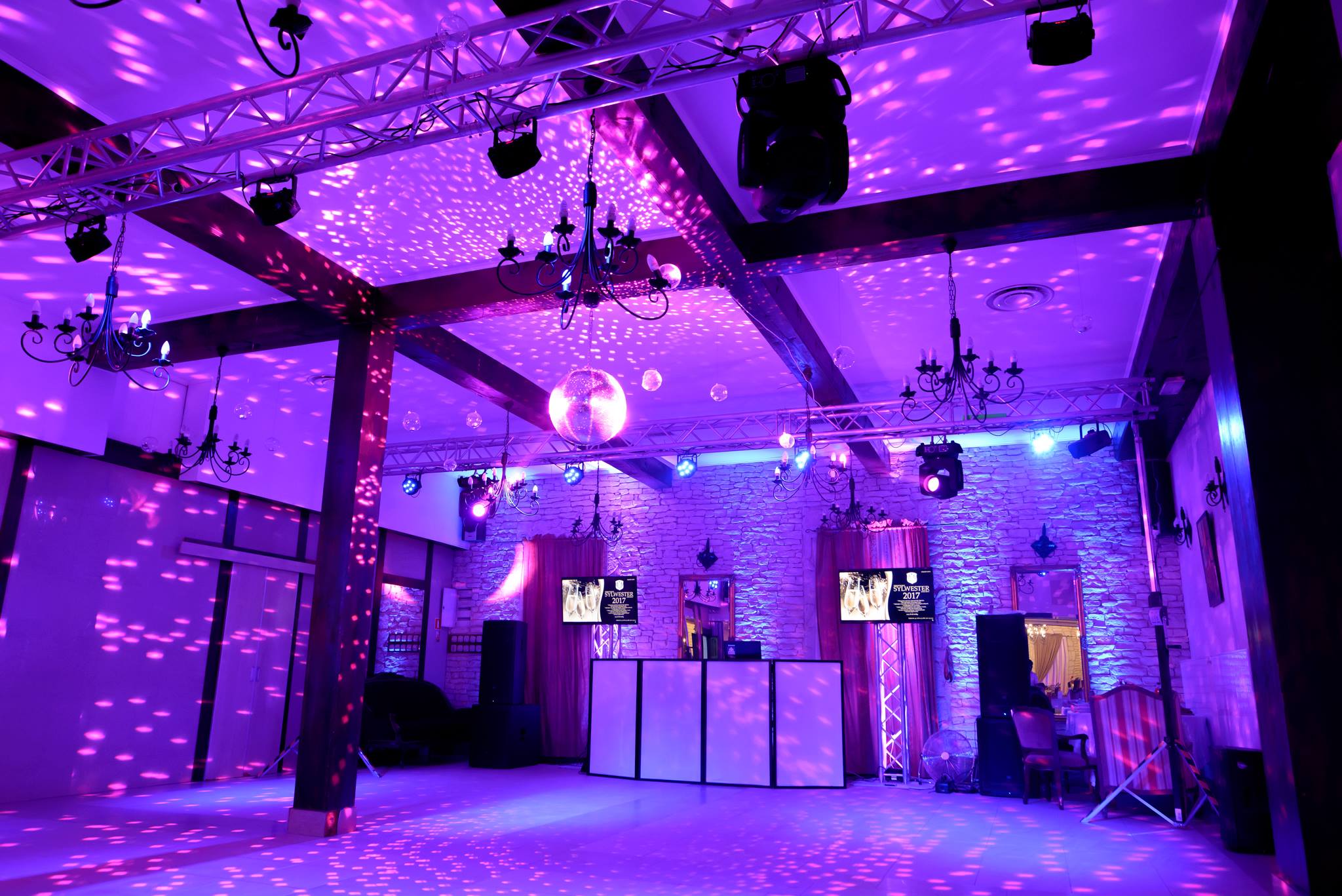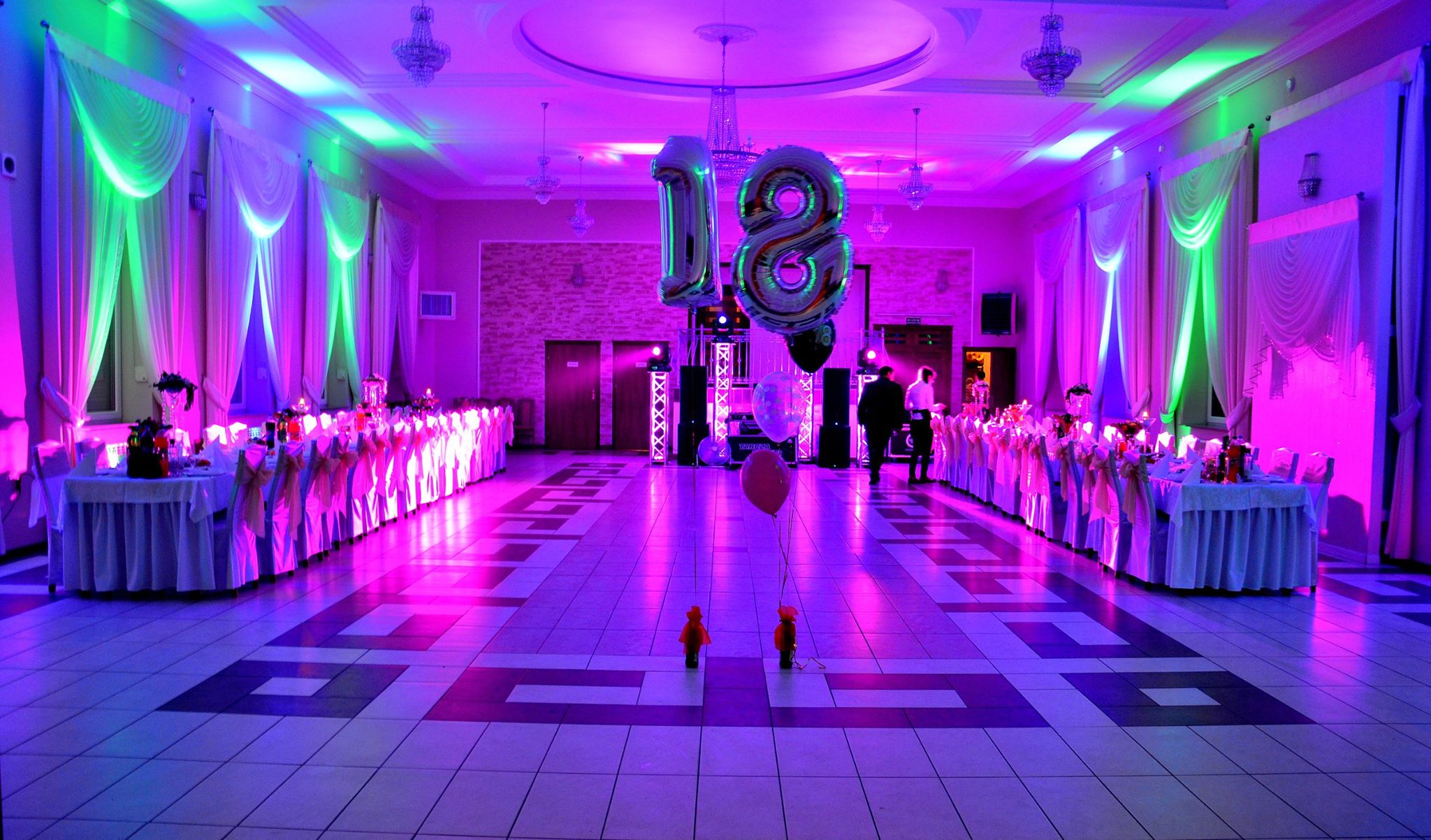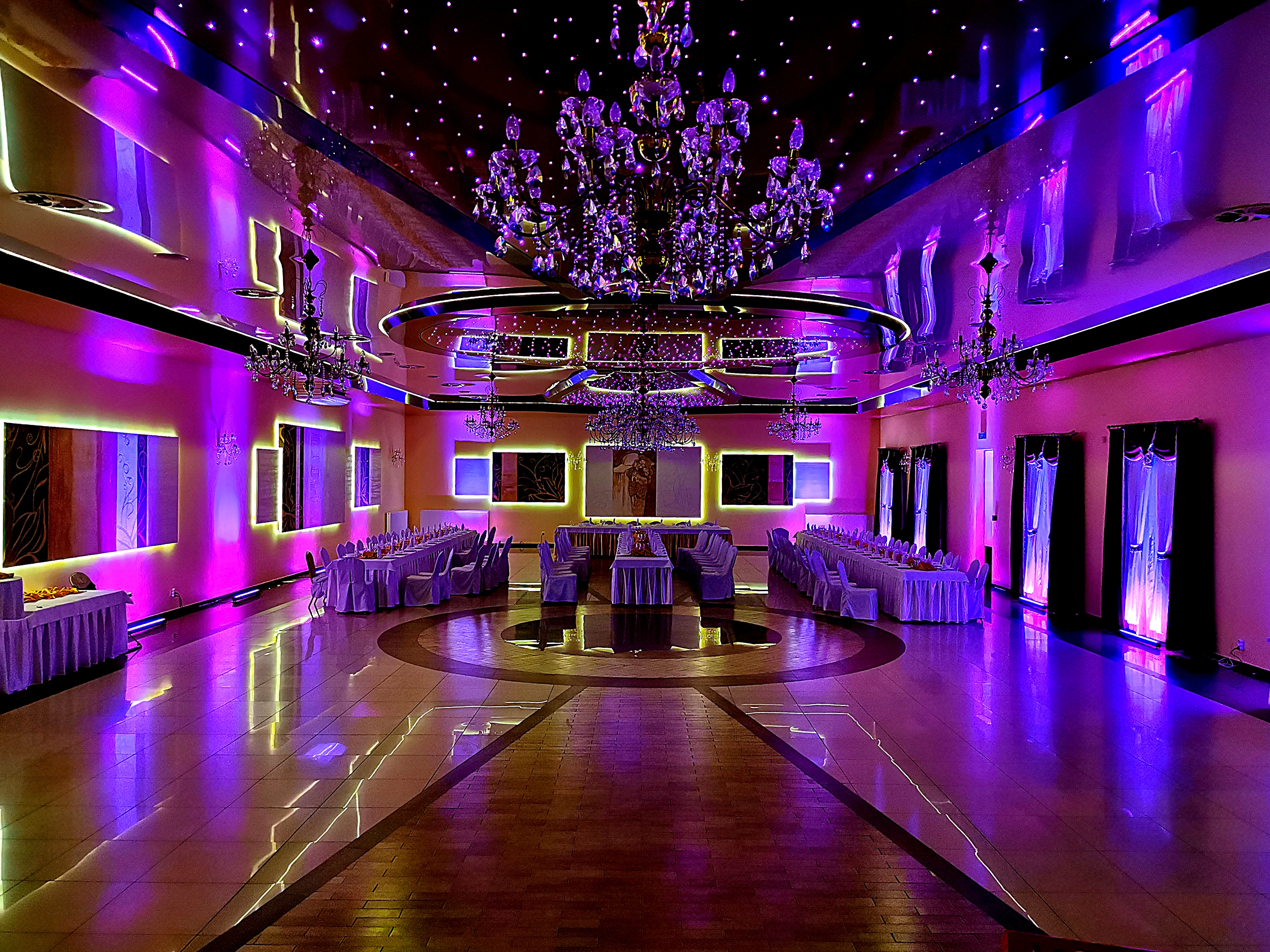Ściany skąpane w ciepłych barwach, romantyczna poświata wokół parkietu, subtelnie podkreślone detale sali — wszystko dopasowane do stylu i kolorystyki Waszego wydarzenia.